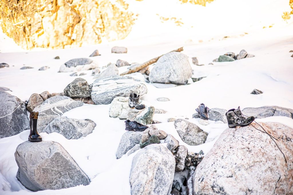 Никогда не знаешь наверняка, какая обувь пригодится. Иногда нужны резиновые сапоги, если лёд подтаял на солнце. А иногда — зимние ботинки, а также ледорубы, палки и «кошки»