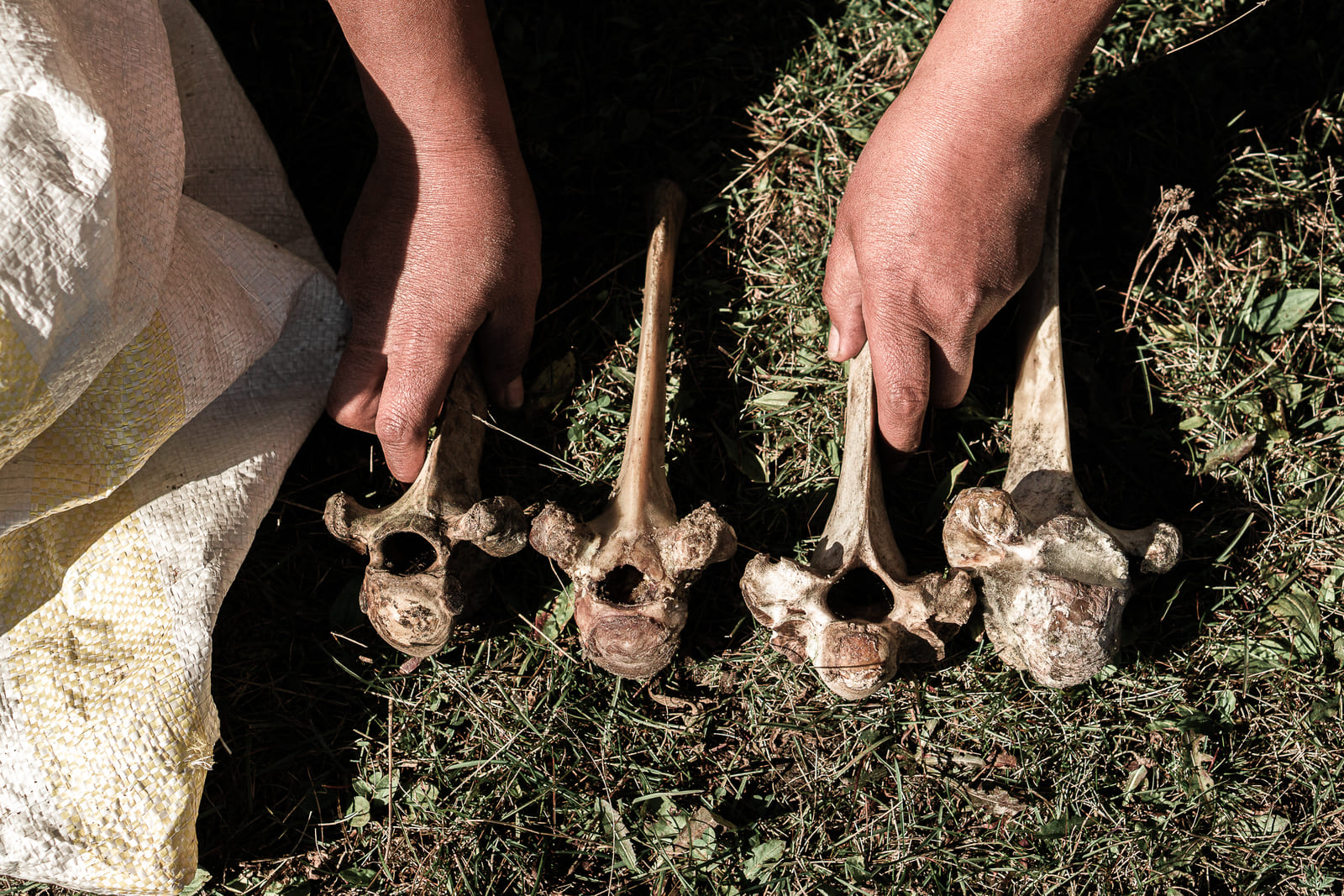 Из мешка на траву вываливают хребтовые кости, которые принёс друг Жалсыпа Ардын. Их штук 20, на конце каждой — позвонок размером с мужской кулак (костоломы называют его «шапка»). Некоторые кости покрыты серо-зелёной плесенью и пахнут гнилью. «Неправильно хранили», — вздыхает Долгор. Она голыми руками берёт одну кость длиной в две ладони женщины. Толщина — с сантиметр. Долгор вытаскивает нож, очищает кость от мяса. Подрезает её конец — иначе при разбивании осколки кости могут поранить руки. Смотрит на свои ладони — небольшие, кожа чистая, ногти коротко пострижены. «Мозоль этой костью натру», — говорит Долгор и цокает языком.