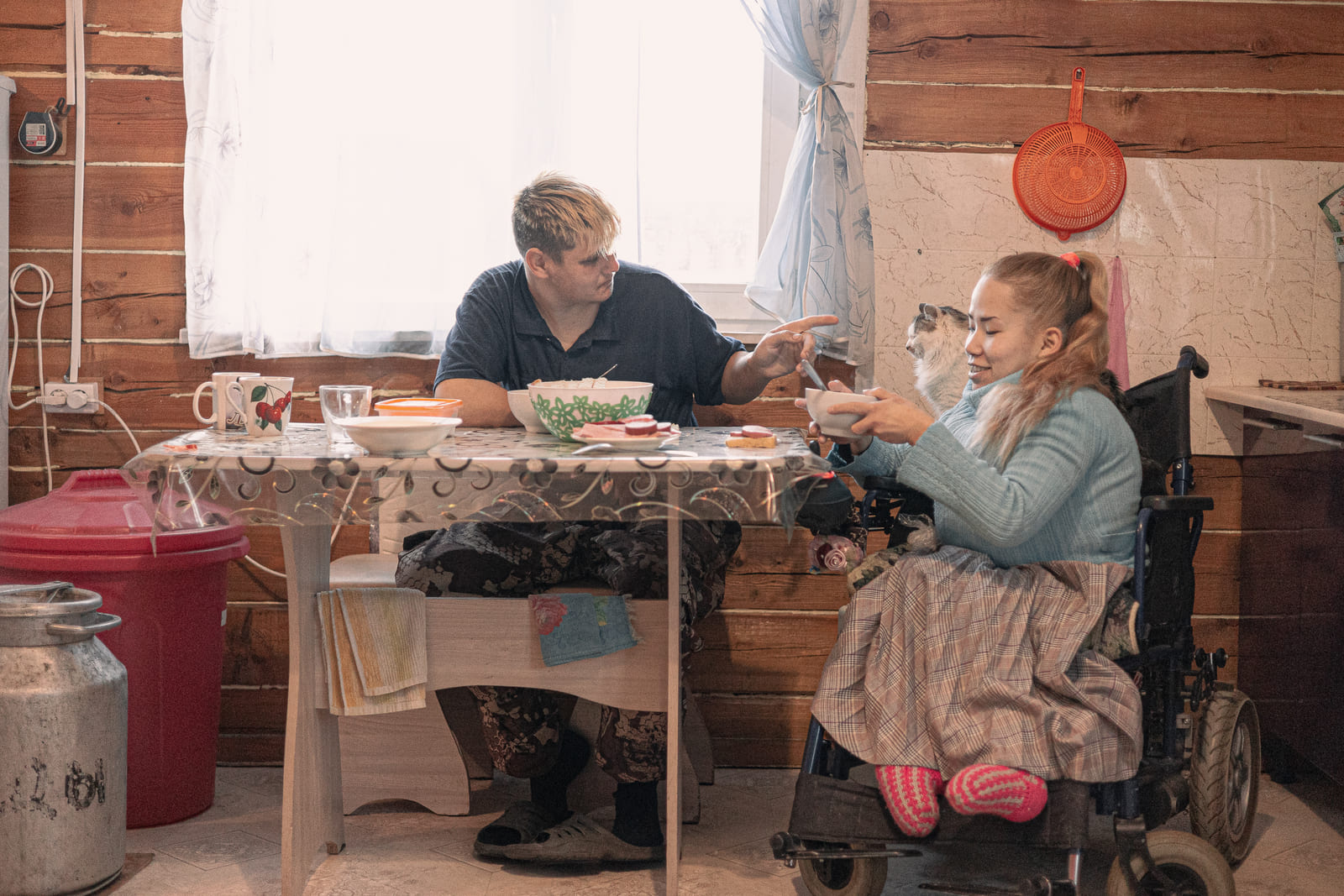 В соцдеревне живёт только Жаргалма, её муж Иван и её подопечные. Больше никого — только иногда приезжают две нянечки из интерната. Они обходят квартиры и помогают подопечным — кому с уборкой, кому с приготовлением еды.