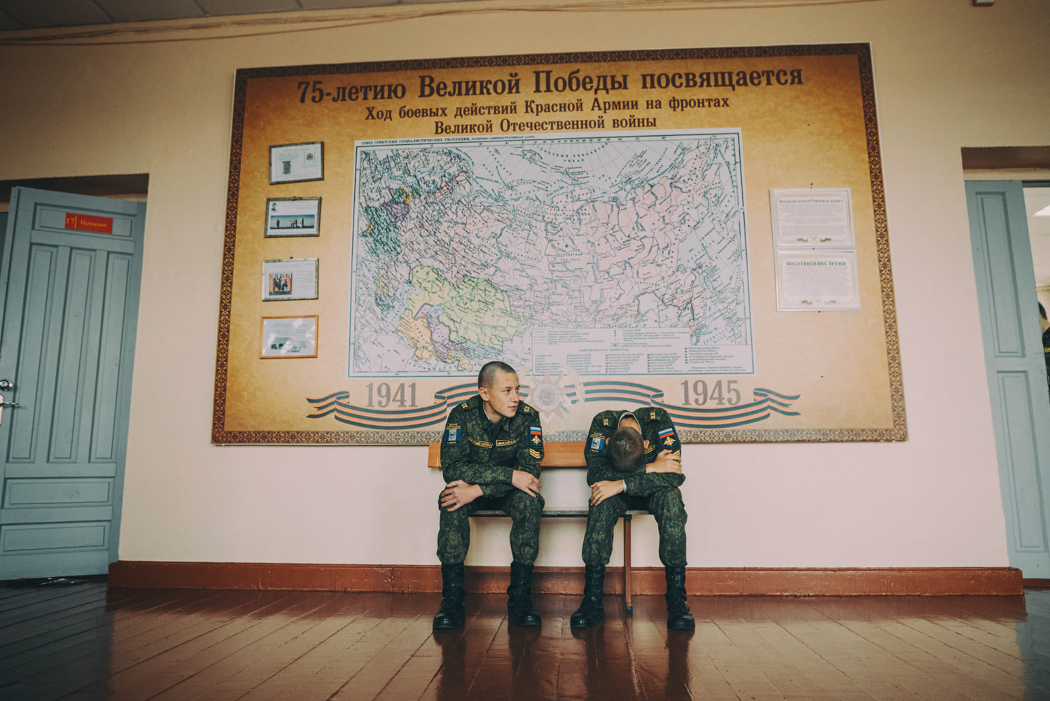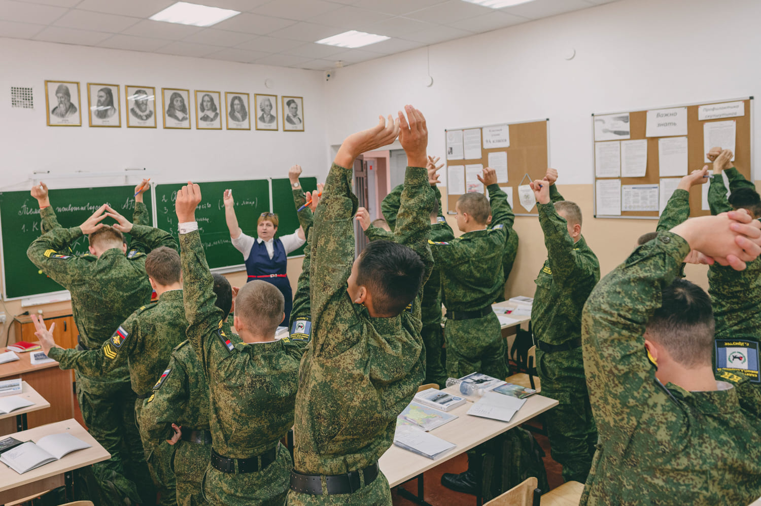 Чёрную парадную форму на урок кадеты надевают только по особенным случаям. Например, в День учителя, когда в корпусе проходит день самоуправления. Кадеты полностью заменяют учителей и администрацию. Кадеты-пятикурсники (в кадетском училище пятый курс — это как 11 класс в обычной школе) проводят уроки в младших классах. На фото пятикурсник ведёт географию у кадет четвёртого курса. Анна Диденко рассказывает, что ученики слушали старшекурсников внимательнее, чем в обычное время учителей. «Это не показуха, — говорит она, — это дисциплина. Ученики реально выполняют задания, а „учителя“ объясняют всё максимально подробно».