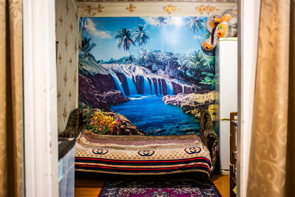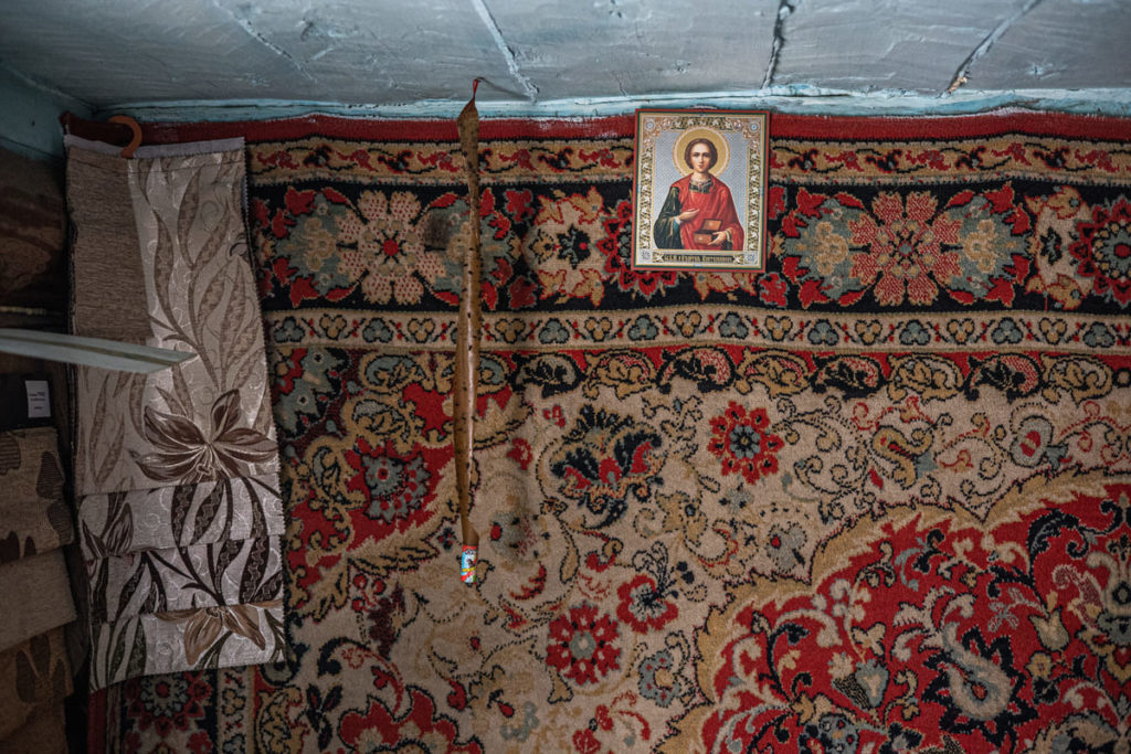 Эта фотография с иконой на фотообоях, а также заглавная, с медведем, особенно привлекательные для меня из этой подборки. В них много деталей, сочетаются казалось бы несочетаемые вещи. Обе фотографии сняты в одном доме в деревне Кумарейка в Балаганском районе. Мы приезжали к одной старушке вместе с фельдшером скорой помощи на вызов.