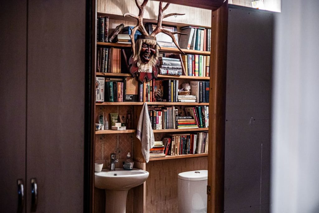 Дверь в туалет в доме учительницы из деревни Манзурка Качугского района. Чтобы оборудовать санузел, она отгородила часть зала. Полки с книгами и картина-рога смотрятся необычно на фоне сантехники. Кроме того, в туалете хранятся лыжи, на которых учительница ходит зимой по лесу.