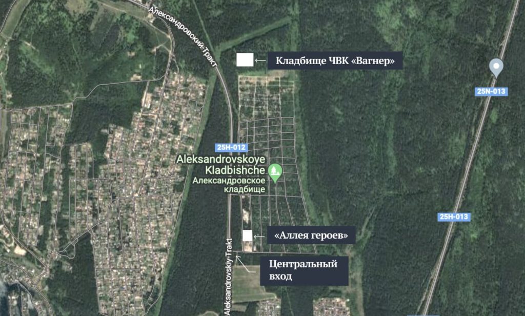 Чтобы добраться до квадрата «вагнеровцев», нужно пройти насквозь всё кладбище. Захоронение ЧВК в самом дальнем углу, отдельно от остальных могил. Участок расчистили от леса в конце сентября — начале октября. Именно в это время читательница ЛБ ездила на Александровское кладбище и видела, как его расширяют — рубят деревья на краю участка. Она записала видео и прислала его в редакцию. По космоснимкам также видно, что 15 сентября на этом месте росли деревья, а второго октября их уже не было.