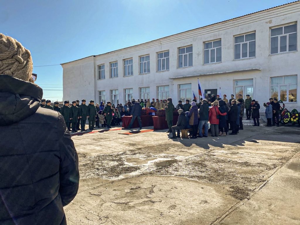 Не делили погибших на мобилизованного и наёмника и на торжественном мероприятии, которое прошло у здания школы перед похоронами. Гробы стояли перпендикулярно белому двухэтажному зданию рядом с надписью «Выпуск 2022». Попрощаться с Федосеевым и Игумновым пришло больше сотни односельчан.
