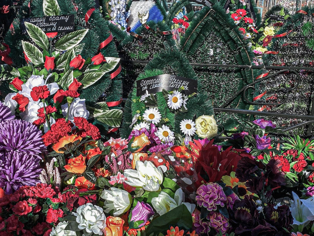 Небольшая оградка на две могилы заставлена венками. Мужу — от Минобороны: на зелёных ветках искусственными цветами выложен флаг России, на чёрной ленте надпись: «Защитнику Отечества». Сыну венок от государства не положен, но ЧВК прислала свой — в чёрно-жёлто-красных цветах со скрещёнными мечами по центру и словами: «Кровь, честь, Родина и отвага».