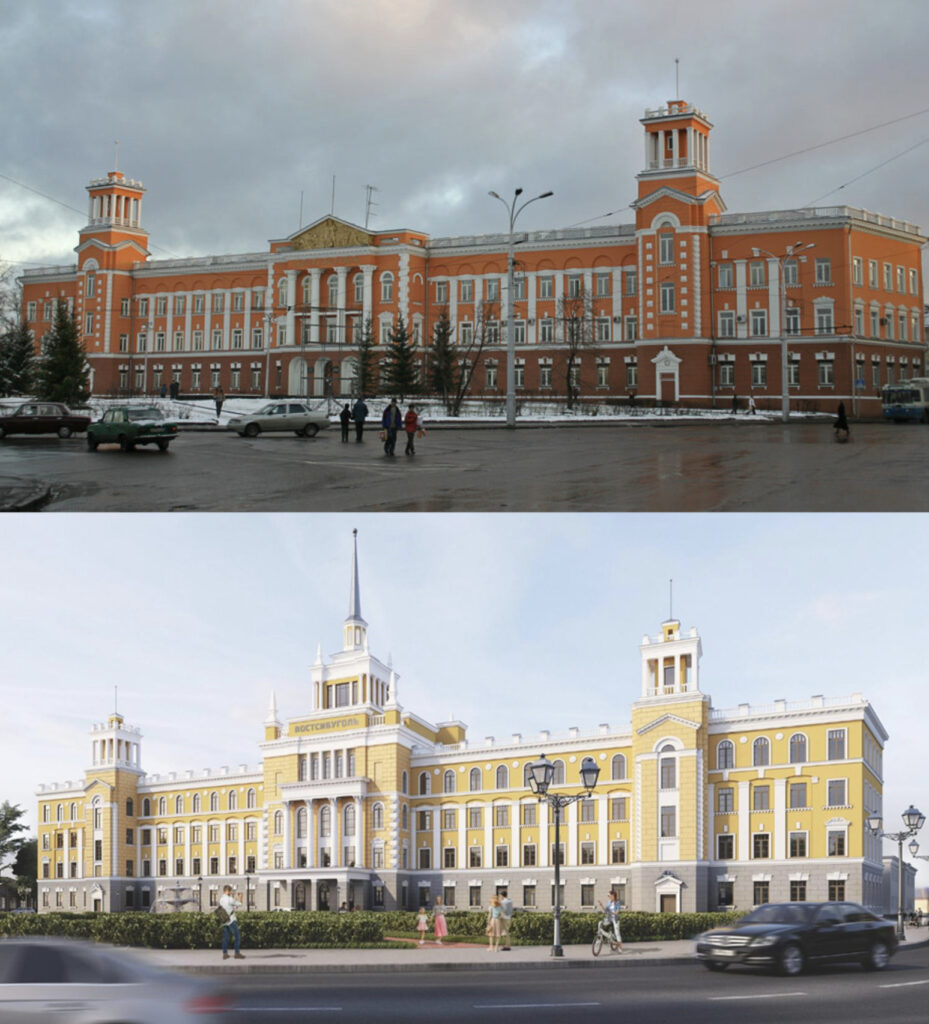 Здание по проекту иркутского архитектора-инженера Ивана Ефимова появилось в 1950 году и считается одним из символов города. En+ сообщает, что «все элементы декора максимально оберегаются», но после реконструкции его будет не узнать: появится башня со шпилем, дополнительный этаж и эстрада с колоннадой по центральной оси. Для надстройки нового уровня уже снесли две башни, которые сейчас фланкируют основной объем.Также демонтируют горельеф «Шахтеры» на центральном фасаде. Его обещают установить отдельно во дворе, который сделают общественным.