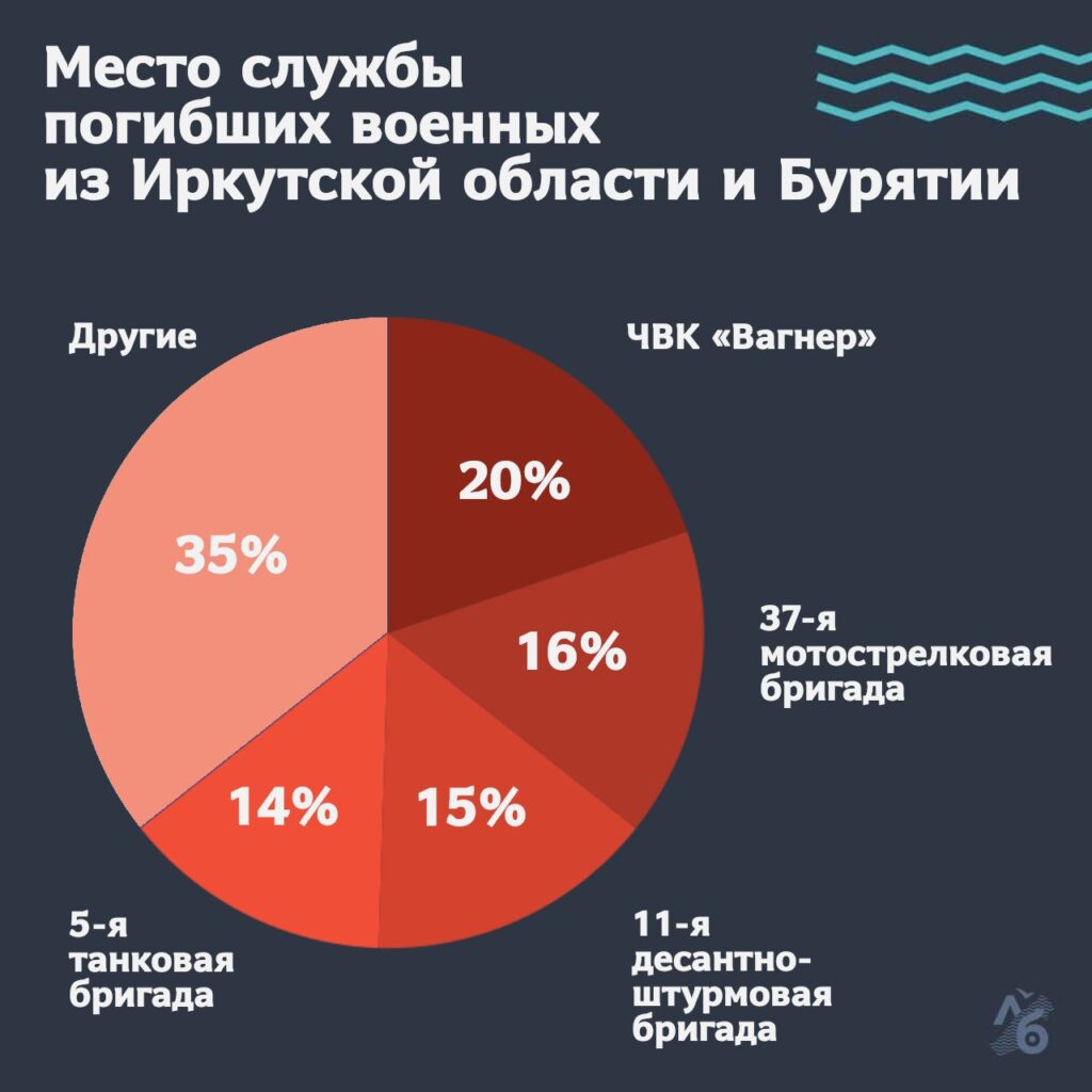Больше, чем из 11-й ОДШБр, погибших из ЧВК «Вагнер» — 353 человека и 37-й мотострелковой бригады (Кяхта) — 267 человек. В составе 5-й танковой Тацинской бригады (Улан-Удэ) воевали 239 погибших.