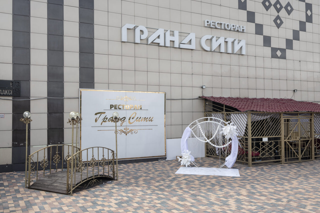 В будний день в июле 2025 года ресторан «Гранд сити» закрыт. Перед входом выложена пестрая брусчатка. Стоит золотая рамка с тюлем и воздушными белыми цветами для фотосессий, рядом декоративный мост с завитками из желтого металла. Ресторан огорожен металлическим забором с золотыми национальными орнаментами. Чуть дальше — парковка, где произошла перестрелка. Там уже все не так нарядно.