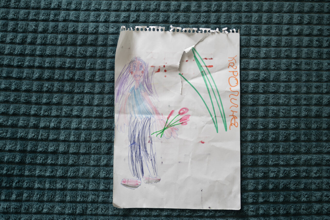 Шестилетняя Каролина много рисует мать, карандашными картинами увешаны стены в квартире. Аяна на детских рисунках грустная, уголки губ смотрят вниз, на щеке черная галочка — это шрам. Чтобы мама не так сильно грустила, на рисунке Каролина вложила в руки Аяны букет красных тюльпанов. Еще на одном рисунке видна только верхняя часть лица, Аяна будто выглядывает снизу. Чтобы маме не было обидно, сверху Каролина нарисовала зеленое сердечко и звездочку.