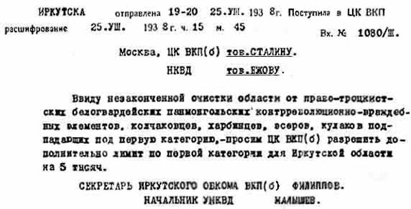 Сохранились телеграммы иркутских властей, в которых они просят Москву выдать новые квоты «по первой категории» — так тогда официально называли расстрел. «Ввиду значительной засоренности области право-троцкистскими, пан-монгольскими и кулацко-белогвардейскими элементами, подпадающими под первую категорию, просим ЦК ВКП(б) разрешить дополнительный лимит по первой категории для Иркутской области 4 тысячи. И.О. секретаря Иркутского обкома ВКП(б) Филиппов. Начальник НКВД по Иркутской области Малышев», — телеграфировали они в апреле 1938 года. На телеграмме стоял ответ: «За» и подпись Сталина, Молотова, Ворошилова, Кагановича, Ежова, Микояна и Чубаря.